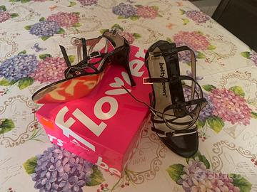 Sandali di vernice nuovi, mai usati, cinturini in pelle, plantare confortevole e laccetti che fissano il piede rendendo il sandalo comodissimo.tacco di 9 cm e scatola sua inclusa.Betty Flowers