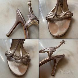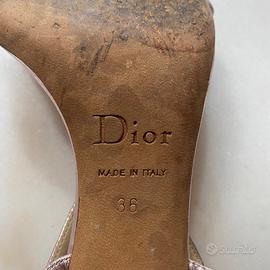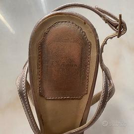 Vendo Sandali originali vintage di Christian DIOR in pelle di colore rosa antico effetto metallizzato con logo dorato D pendente davanti. Molto chic!