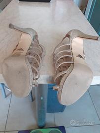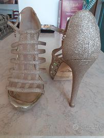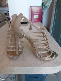 Sandali oro, con tacco e piccolo plateau, chiusura con laccetto e fibbietta. Glamour. n.38. Indossate due/tre volte.