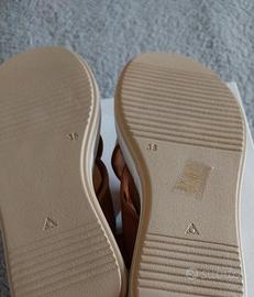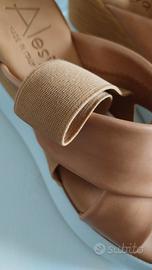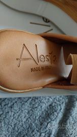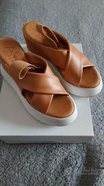Bellissimi sandali con zeppa firmati Alesya, realizzati interamente in Italia. Un modello moderno che unisce l'eleganza della pelle alla comodità di una suola platform sportiva. Perfetti per l'estate, slanciano la figura senza rinunciare al comfort! Caratteristiche principali: Marca: Alesya Taglia: 38 (calzata regolare) Colore: Cuoio / Naturale con suola bianca a contrasto. Materiale: Vera pelle di alta qualità (Art. 5455 Pelle Taiss Naturale). Dettagli: Fasce incrociate sul davanti e cinturino posteriore elastico in tinta per una calzata sicura e adattabile. Altezza tacco/zeppa: Circa 7 cm (come visibile in foto con metro). Stato: Come nuovi / Ottime condizioni (ancora nella loro scatola originale). Perché acquistarli? La zeppa effetto legno e la para bianca li rendono super versatili: perfetti sotto un abito lungo, dei jeans o una gonna. La qualità del Made in Italy garantisce morbidezza e resistenza.