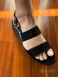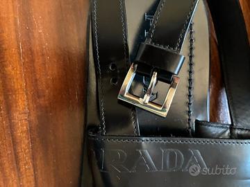 Sandali Prada in pelle nera lucida con doppia fascia frontale larga, cinturino alla caviglia regolabile con fibbia acciaio. Logo “PRADA” in rilievo sulla fascia. Suola in gomma con logo ovale e “Made in Italy”. Design minimal ed elegante modello classic.