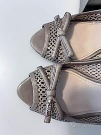 Sandali PRADA open toe, in pelle di vitello traforata, fiocco sul fronte con logo PRADA, color pietra pomice, tacco in vero sughero. Tg. 37