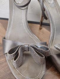 Eleganti sandali di design firmati René Caovilla, in raso di seta grigio, con cinturino alla caviglia ed un elegante fiocco tempestato di pietre Swarovski. La suola esterna è glitterata con logo ben visibile.