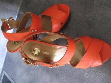 Vendo sandali , marca river island, colore arancio. Numero 37, tacco largo e plateau sulla parte anteriore. Altezza del tacco 13.5 cm e altezza plateau 4 cm. Chiusura con fibbia. Indossate una volta, sono come nuove.
