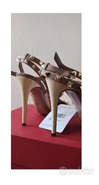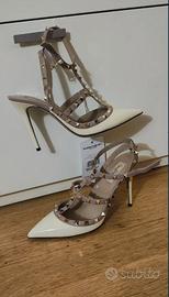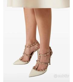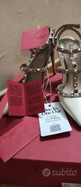 Iconiche décolleté Rockstud di Valentino Garavani, un modello distintivo che unisce l'eleganza classica a un'estetica rock-chic contemporanea. Design: Il modello presenta una struttura "caged" (a gabbia) con cinturini multipli che avvolgono il piede e la caviglia. Materiali: Sono realizzati in una combinazione di pelle verniciata (sulla punta) e nappa (per i cinturini). Dettagli Rockstud: La caratteristica saliente sono le borchie piramidali con finitura color oro applicate lungo tutti i cinturini. Colorazione: La versione in foto presenta una combinazione bicolore, solitamente denominata Avorio/Poudre o Bianco/Rosa Polvere, con la punta chiara e i cinturini in una tonalità nude/beige. Tacco: Questo specifico modello monta generalmente un tacco a spillo da 100 mm (circa 10 cm). Chiusura: Sono dotati di cinturini alla caviglia regolabili con fibbie metalliche laterali. ModelloRockstud Caged Pump Materiale esternoPelle verniciata e Nappa Altezza tacco100 mm ColoreAvorio e Poudre (Beige) Produzione Made in Italy Articolo AUTENTICATO DA ENTE CERTIFICATORE piccoli segni di usura come da foto Valore acquisto € 950,00