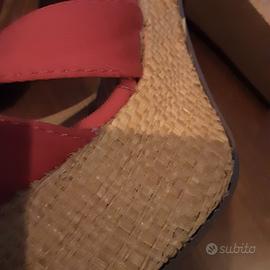 vendo sandali rossi da donna in seta con tacco e zeppa in materiale naturale tipo paglia intrecciata, comodi e usati molto poco in pratica nuovi, misura 38, tacco 12,5cm e zeppa 3,5cm. solo se interessati no perditempo, non trattabili. grazie.