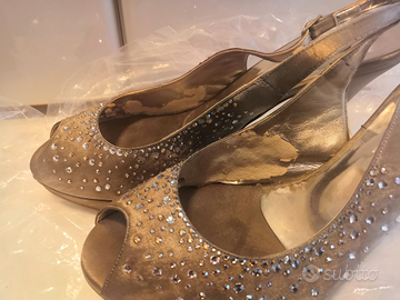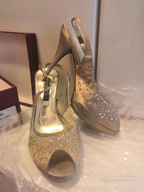 Sandali, scarpe cerimonia tacco alto (circa 11 cm) in raso color fango numero 40, con applicazioni in swarovski, marca Albano.