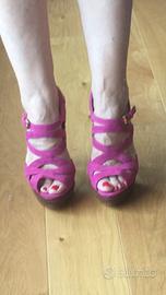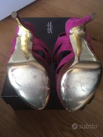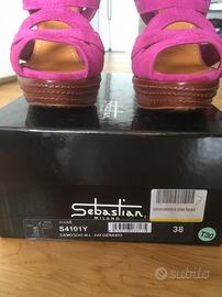 Sandali Sebastian originali color fucsia in camoscio tg 38. Suola in cuoio, tacco 14 cm, plateau 3cm. Doppio cinturino, alla caviglia e sul collo del piede, per la regolazione. Scatola e dust bag. Mai indossati.