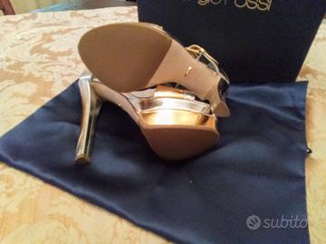 Sandali Sergio Rossi in pelle di vitello laminato bicolore oro e argento. N. 37 e 1)2. Tacco alto cm 12 con zeppa di 4 centimetri. Nuovi mai indossati. Con scatola originale e sacco custodia.