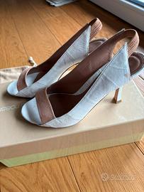 Elegante e chic sandalo bicolore Sergio Rossi in vera pelle di anguilla lucida bianca e dettagli in camoscio, suola in vero cuoio.