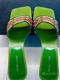 Eleganti sandali firmati Sergio Rossi, espressione dell’eccellenza artigianale italiana e di uno stile ricercato. Il modello presenta una fascia in pelle di cavallino intrecciata con motivo multicolor, che dona carattere e unicità alla calzatura. La soletta verde iconica del brand crea un raffinato contrasto cromatico, mentre il tacco largo in legno garantisce stabilità e comfort. •Materiale: pelle di cavallino intrecciata •Dettagli: inserti multicolor (rosso, rosa, azzurro) •Tacco: legno, medio e stabile •Modello: slip-on •Taglia: 38 Condizioni: buone condizioni generali, con lievi segni di utilizzo visibili nelle foto. Perfetti per completare look estivi sofisticati o per aggiungere un tocco distintivo a outfit minimal. Un pezzo originale e senza tempo firmato Sergio Rossi.