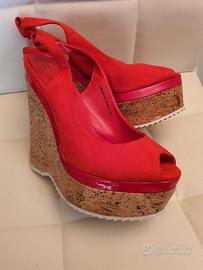 Bellissimi sandali Silvian Heach, rosso scamosciato sintetico con profilo vernice, con zeppa in sughero altezza cm.15 compreso plateau.