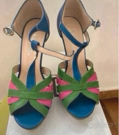 Sandali eleganti con tacco alto e plateau. - Design con fasce intrecciate multicolor (rosa, verde). - Cinturino alla caviglia con fibbia regolabile. - Tacco sottile e slanciato.