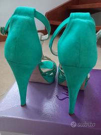 Splendidi sandali con tacco alto (12 cm) color turchese/verde acqua, marca Novità. Un accessorio elegante e di altissima qualità, perfetto per cerimonie, eventi o serate speciali.