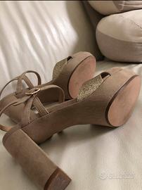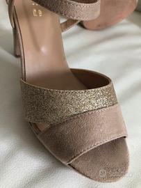 Sandali in camiscio e pelle con brillantini oro, tacco alto 10cm e plateau 2cm. Misura 38
