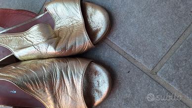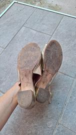 Scarpe in pelle color oro, comodissime (il tacco è alto (5,5 cm), con incrocio sul davanti per tenere fermo il piede e cinturino alla caviglia con fibbia.