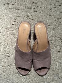 Sandali lilla chiaro, in camoscio, tacco medio a blocco, punta e tallone aperti, in buone condizioni.