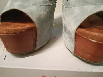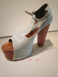 Sandali modello Jeffrey Campbell in cuoio scamosciato color carta da zucchero con tacco grosso 12,5cm e plateau 5cm.