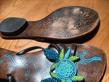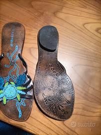 sandali cafènoir usati una sola volta. particolare con lavorazione di perle di colore verde turchese chiaro e turchese scuro.