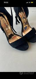 Eleganti sandali in velluto nero del brand Tulipano, con tacco alto da 11,5 cm e cinturino alla caviglia che valorizza la silhouette del piede. Design raffinato e perfetto per completare outfit da sera.