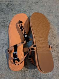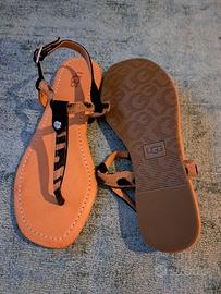 Sandali infradito UGG modello Madeena, nuovi. Pelle e pelo di vitello con stampa animalier. Taglia 38 Colore Light Butterscotch / Black con inserti animalier Cinturino regolabile alla caviglia, rivetto metallico logato UGG sulla parte anteriore.
