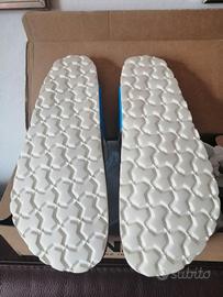 Nuovi, bellissimi, di un blu chiaro brillante e particolari in bianco. Suola in pelle e fondo in morbida gomma antiscivolo. Modello unisex a pianta larga, comodissimi. Marca SUNBAY, garanzia di qualità.