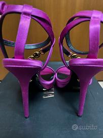 - Punta quadrata aperta, fascia ad una dita, chiusura con fibbia alla caviglia, suola in pelle con logo, suola in pelle e stiletto intero