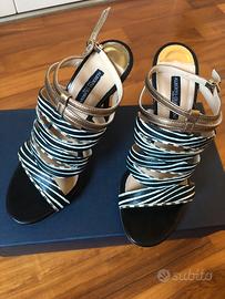 Sandali totalm in pelle, cinturino alla caviglia. Indossato 1 volta. Cinturino dorato, tacco 10.5cm color rame. Presenti eventuali Tacchetti sostitutivi. Confezione originale.