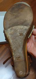 Vendo sandali con zeppa in legno indossati ma in buonissime condizioni, marca Obsel, con intreccio sul davanti color cuoio e giallo fluo, cinturino alla caviglia, zeppa in legno cosi come la suola con inserto colorato a metà altezza, nonostante il legno non sono pesanti da portare, misura 39, altezza plateau cm 4 e altezza zeppa cm 12, suola in gomma un po’ rovinata e appiccica poiché sono anni che non li indosso più ma che si può far sostituire dal calzolaio. Proprio perché appiccica un po’ la suola li vendo a 15 eu, le scarpe in sé sono in ottime condizioni.