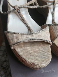 Sandali flatform con zeppa, originali marca Rodo Firenze, made in Italy, nr. 40, in iuta foderata in vero cuoio, con decorazione metallica bronzea, con conturino alla caviglia e zeppa alta 9 cm con plateau alto 3,5 cm. Suola in vero cuoio larga 7,5 cm e lunga 25,5 cm dal tacco alla punta. Indossati poche volte, qualche piccolo segno d'usura: sulla punta sinistra e sul laccetto sinistro, come in foto.