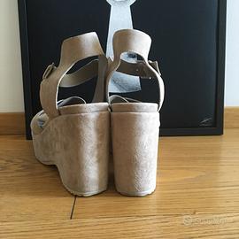 Sandali con zeppa in morbido camoscio color tortora, marca Janet Sport ( Janet & Janet ) n.41, comprati l'estate scorsa e indossati solo una volta. Purtroppo per un problema al piede non potrò più indossarli quindi preferisco venderli e non averli più sotto gli occhi ?