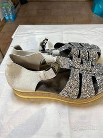 Scarpe basse sandali, eleganti due colori bianco e brillantinato, ben tenuto. Con suola bianca. Marca Divine Follie.