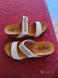 Vendo un paio di sandali con zeppa nuovi, tipo modello sanitario, con due fasce bianche di cui una con strappo, senza confezione originale.
