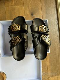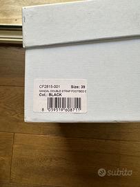 Sandalo nero con fibbie oro, completo di scatola, usato pochissimo., numero 39.