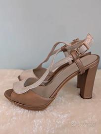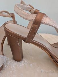 Sandalo con cinturino, in pelle color oro, in due tinte, oro lucido e più luminoso con striature nella parte di pelle di camoscio, e oro bronzo nel tacco e nel plateau. L'interno è totalmente in pelle di colore beige Tacco 10 Taglia 37 ⚠️Presenta alcuni graffi sul tacco e nel plateau, il sandalo è stato comunque indossato pochissime volte ed è in ottime condizioni generali ❣️ottima fattura e robusta Brand Duelune, artigianale made in Italy
