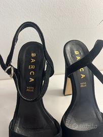 Sandalo con tacco 15 e plateau 5 cm. Anche se alte, le scarpe più comode che abbia mai avuto! Sono in pelle e velluto, con cinturino appena sotto la caviglia. Usate pochissimo. Di BARCA.