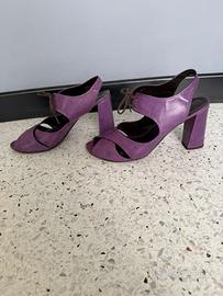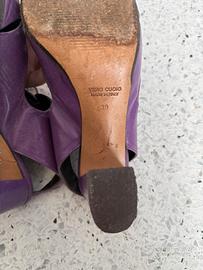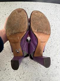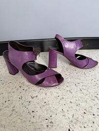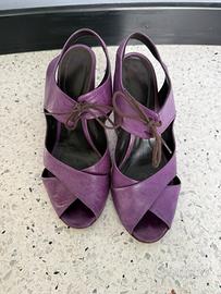 Sandalo viola in pelle con lacci marroni sulla parte davanti (con possibilità di cambiarli) della Fruit Tacco alto 9cm Presentano qualche segno d’usura sulla suola e qualche piccola macchia sulla pelle, che si possono vedere dalle foto Made in Italy