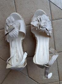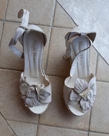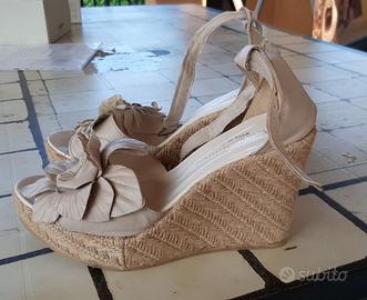Sandalo in pelle beige e zeppa in corda, Moda Shoes, Made in Italy. Fiore in pelle davanti e cinturino alla caviglia. Scarpa n. 36. Mai indossate, Nuove.