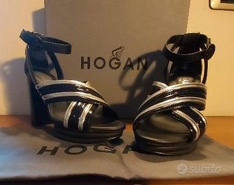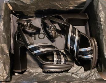 Elegante sandalo da donna in pelle metallizzata con fasce incrociate nere e argento, cinturino alla caviglia, fibbia laterale e plateau in gomma. Scarpa di punta del Made in Italy che coniuga la femminilità di un sandalo Hogan con comodità e praticità di utilizzo.