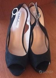 Il sandalo alto nero spuntato Malien Shoes in camoscio allacciatura cinturino è una scarpa da donna di qualità dal design classico. La tomaia costruita interamente in tessuto vernice fa della calzatura un accessorio raffinato perfetto per cerimonie, occasioni formali, ma anche nelle serate importanti. Il piede è elegantemente vestito da fascia all'avampiede e cinturino al tallone. Un sandalo elegante con tacco largo fashion e comodo da indossare ideale per le donne glamour che amano vestire accessori capaci di esaltare la loro femminilità senza rinunciare al comfort e alla qualità.