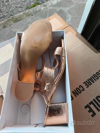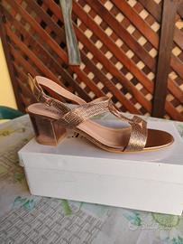 Elegante sandalo oro-rosa.. morbido, con allacciatura al tallone regolabile, accompagna il piede con un intreccio morbido e raffinato, tacco medio e spesso.. nuovo