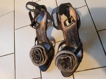 Sandalo originale Emanuel Ungaro (Parigi), in raso grigio con ornamento in pelliccia, tacco 11, numero 36. Le scarpe non sono mai state indossate, quindi sono nuove. Modello di gran classe, prezzo vero affare.