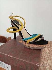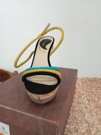 sandalo da donna con tacco alto e plateau in sughero, caratterizzato da cinturini colorati e un laccetto alla caviglia,. Come nuova usata 1 volta