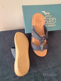 Ciabatta sandalo Fly Flot, in morbida microfibra, colore carta da zucchero, tomaia con velcro regolabile, sotto piede imbottito antishock in pelle. Nuove con scatola