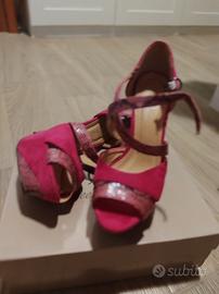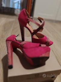 Sandalo numero 37 con tacco 12 cm e plateau anteriore 4 cm di colore fucsia in materiale sintetico con inserti in similpelle stampa rettile usati MA in buono stato