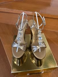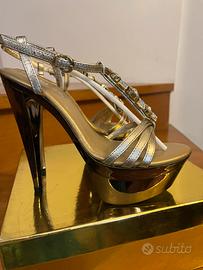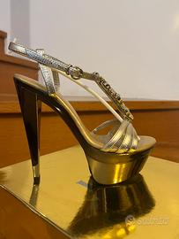 Meraviglioso sandalo gioiello con cristalli con cinturino. Molto elegante, con plateau alto 5 cm. tacco 150 (15 cm.) N. 37 in Oro brunito. Nuovo, indossato solamente per una sfilata di moda.