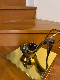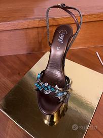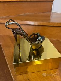 Bellissimo sandalo con swarovscki anticati con cinturino alla caviglia color azzurro cenere. Plateau alto 5 cm. Tacco altezza 15 cm. colore oro bruno Misura n. 37 Come nuovo, usato per una sola sfilata di moda mare. Indicato soprattutto per la stagione estiva.