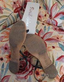 Vendo bellissimi sandali gioiello colore nero. Usati ma fanno ancora una bellissima figura. Unico difetto una leggera usura sul cinturino laterale di un sandalo, ma indossati si nota appena.
