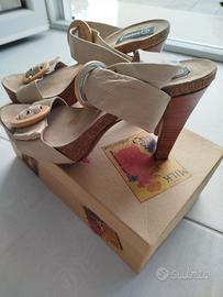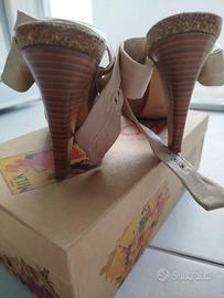 Sandalo con fascia in cuoio regolabile alla caviglia. Effetto nude. Plateau 2,5 cm e tacco 10 cm. Misura 37 Usato solo una volta in sfilata.