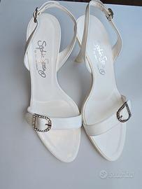 Sandali in pelle colore bianco con fibra con strasse tacco in vernice. Mai indossato, un vero affare.